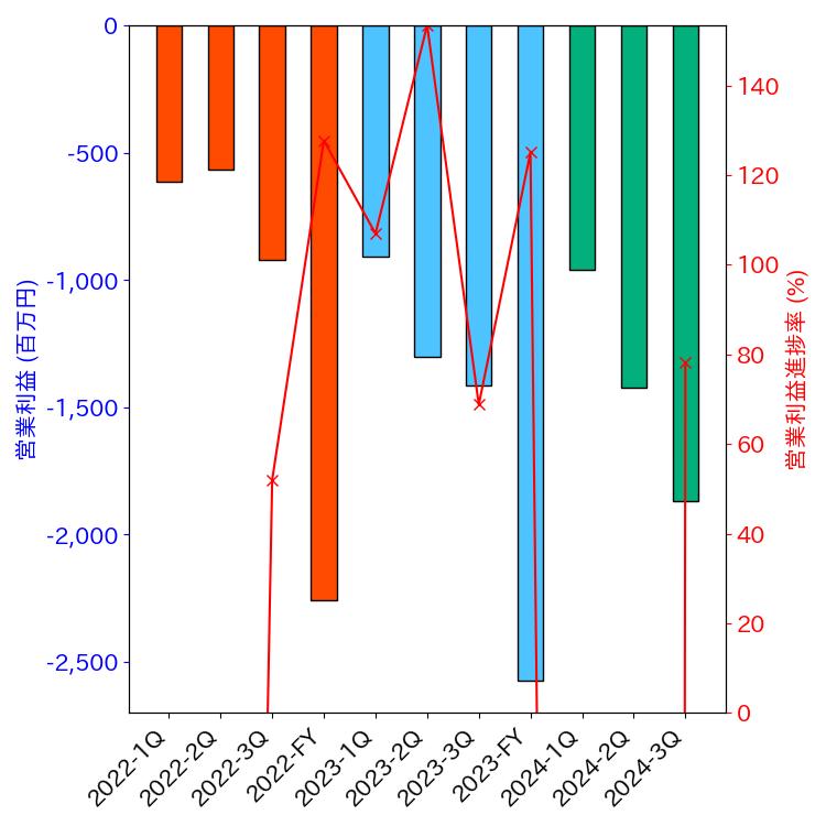 グラフについては各四半期の累積営業利益と会社予想に対する進捗率をプロットしています。進捗率については会社予想営業利益が開示なし、またはレンジ表記の場合は0%となっています。また上方・下方修正がされた場合は開示日以降のデータのみに反映させていますのでご注意いただき概要把握などにお使いください。