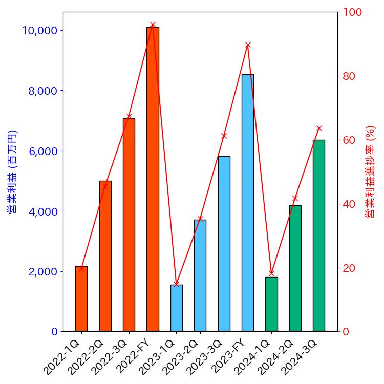 - 売上高13,097,200千円(前年比+17.3%)、営業利益2,945,599千円(前年比+28.4%)、純利益1,702,185千円(前年比+84.9%)。