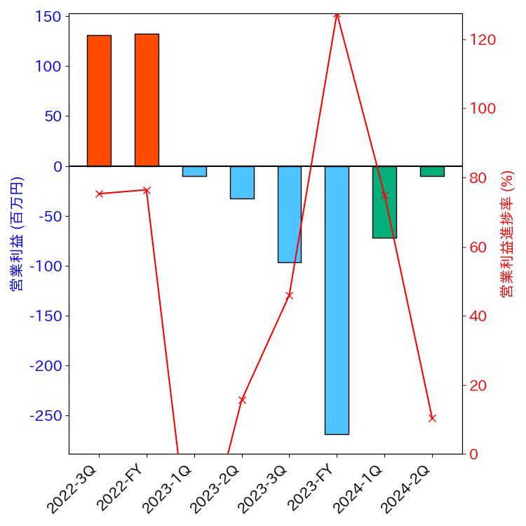 グラフについては各四半期の累積営業利益と会社予想に対する進捗率をプロットしています。進捗率については会社予想営業利益が開示なし、またはレンジ表記の場合は0%となっています。また上方・下方修正がされた場合は開示日以降のデータのみに反映させていますのでご注意いただき概要把握などにお使いください。