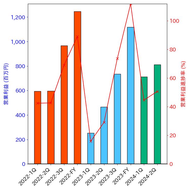 グラフについては各四半期の累積営業利益と会社予想に対する進捗率をプロットしています。進捗率については会社予想営業利益が開示なし、またはレンジ表記の場合は0%となっています。また上方・下方修正がされた場合は開示日以降のデータのみに反映させていますのでご注意いただき概要把握などにお使いください。