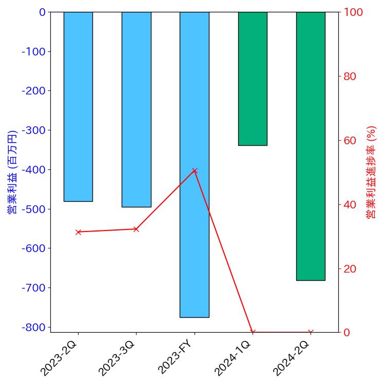 - 売上高は2,941百万円(前年比-30.1%)、営業損失は△639百万円、四半期純損失は△657百万円で、いずれも前年同期比で悪化した。