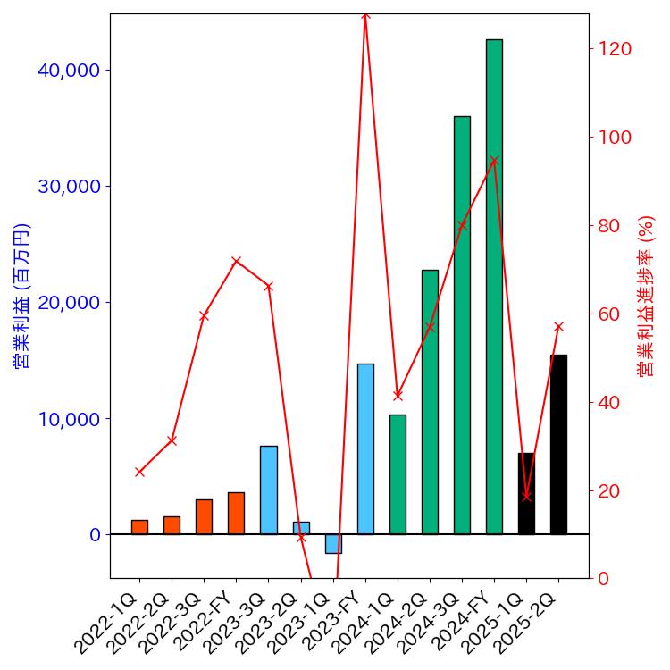 グラフについては各四半期の累積営業利益と会社予想に対する進捗率をプロットしています。進捗率については会社予想営業利益が開示なし、またはレンジ表記の場合は0%となっています。また上方・下方修正がされた場合は開示日以降のデータのみに反映させていますのでご注意いただき概要把握などにお使いください。